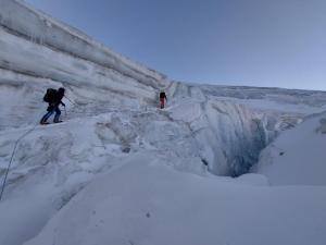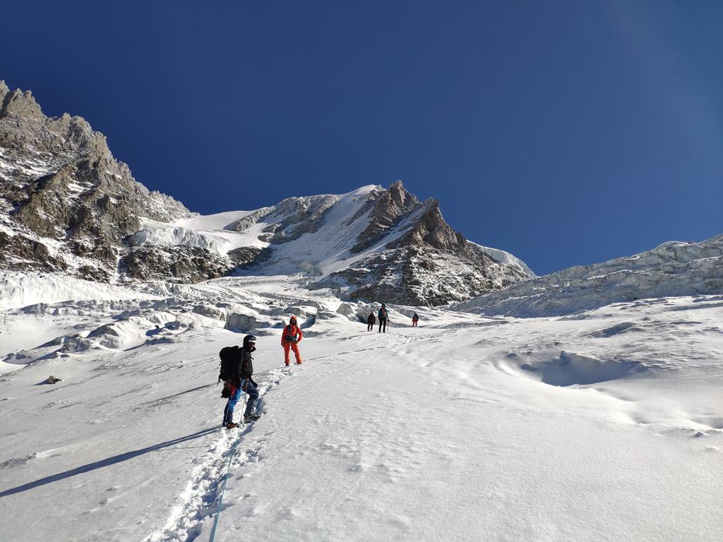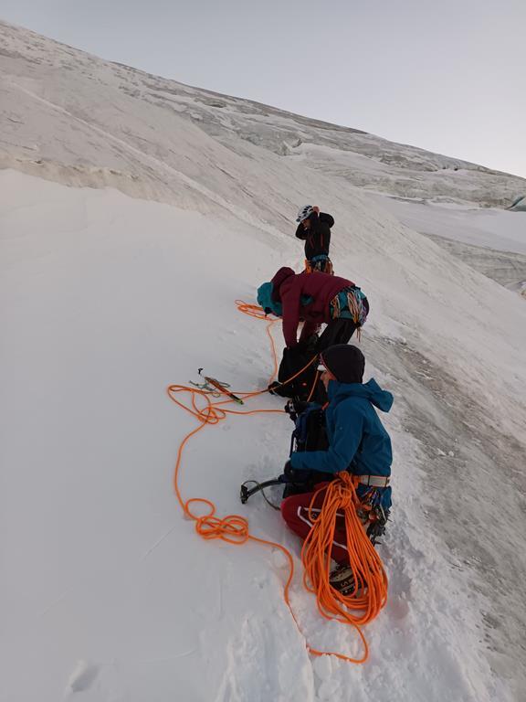 Konačno, nakon dvije odgode treća i završna programirana tura započela je u subotu 01. 10. 2022. g. u ranim jutarnjim satima usponom označenom planinarskom stazom u južnom dijelu doline Valsavarenche (fr. Ouahèntse) iz mjesta Praviou (1830m) preko pastirskih stanova Lavassey (2194 m) sve do skloništa/zimske sobe (fraz. Baracca) koje se nalazi neposredno uz Rif. F. Chabod (2870m). Prethodna psihofizička priprema i primjereni tempo uspona uz stanke za upoznavanje s relevantnim karakteristikama planinske skupine omogućila je da se bez većeg napora iznesu svi potrebni resursi za četverodnevnu aktivnost na velikoj visini. Ubrzo po dolasku u sklonište Baracca i okrijepe pristupilo se pripremama za teoretsku provjeru znanja. Pismeni test je bio inkluzivan i sastojao se je od teorije iz svih modula Programa osposobljavanja (A, B, C i D) čijim je sadržajem zaokružena kompleksna širina nužnog znanja visokogorskog planinara. Testovi su vrednovani odmah i pokazali su solidnu razinu teoretskog znanja svih polaznika što im je omogućilo pristup praktičnoj provjeri planiranoj za naredni dan u okruženju poligona na ledenjaku Laveciau (cca. 3200m).