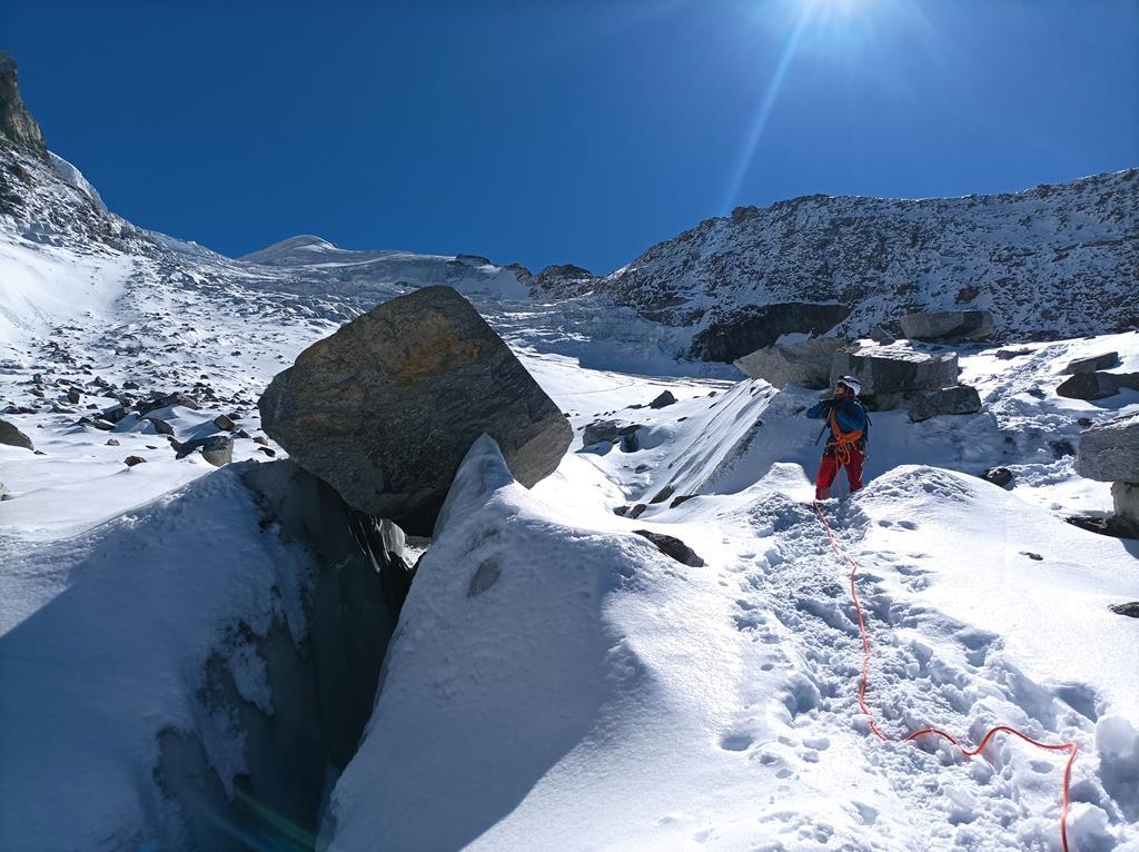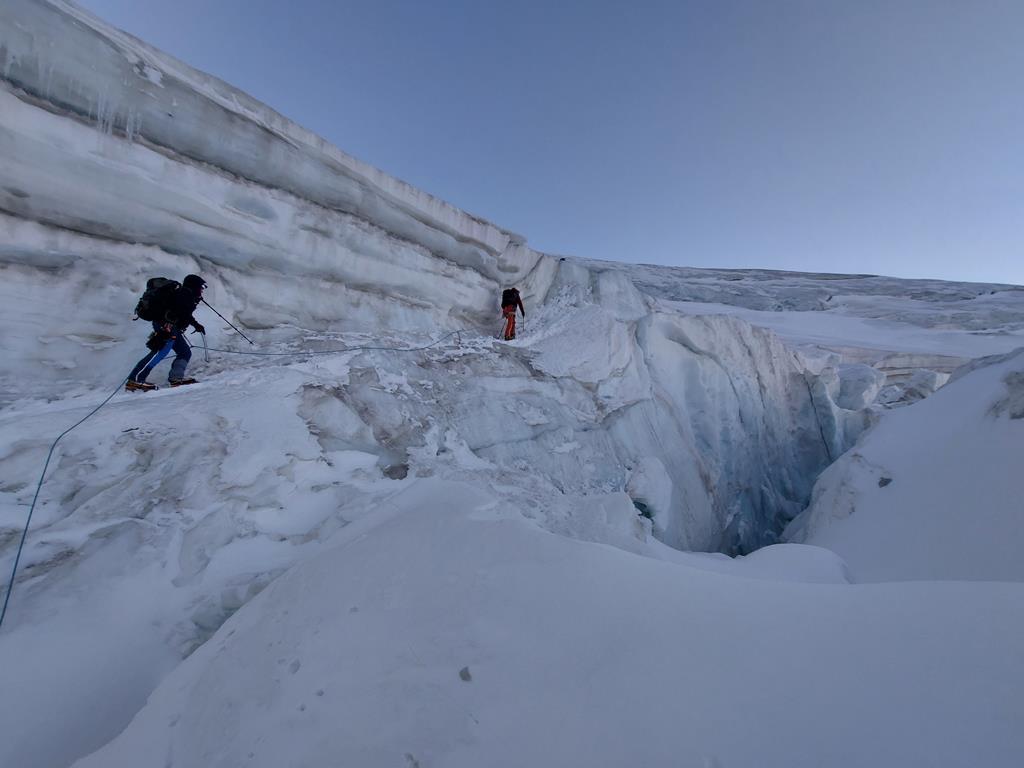 Prije zore narednog dana, u nedjelju 02. 10. 2022., praktični dio provjere započeo je već tijekom samostalne pripreme polaznika raspoređenih u dvije tročlane visokogorske naveze. Uslijedio je uspon neoznačenom ali dobro uhodanom stazom kojom se, prelaskom morene ledenjaka Montandayne ispod zapadnog pobočja vrha Piccolo Paradiso (3923 m), pristupa terminusu ciljanog ledenjaka Laveciau. Za ispitni poligon odabrana je prva zona napetosti u ledenjačkom toku bogata odgovarajućim pukotinama (cca. 3200m). Ispitnu demonstraciju postupaka procjene u incidentnim situacijama, samospašavanja i spašavanja iz ledenjačkih pukotina naučenim metodama polaznici su imali priliku izvoditi na dvije povoljno odabrane lokacije. Prvo su individualno savladavali postavljene probleme a zatim i grupno u navezu kroz simulacije incidenata u realnom okruženju. Na zadovoljstvo svih sudionika ispitnog postupka kvaliteta i sigurna demonstracija svih visokogorskih tehnika potpuno su uvjerile ispitivače i opravdale nastavak prema krajnjem cilju završne programirane ture Modula D a to je bila samostalna priprema i izvedba uspona (silaza) na vrh Gran Paradiso (4061 m). U povratku prema skloništu Baracca pristupilo se izboru najpovoljnijeg mjesta za noćenje na otvorenom (bivakiranje) planiranog za posljednju večer prije spusta u dolinu. Odabrano mjesto nalazilo se je na nadmorskoj visini 3000 m na zaravnatom dijeli kamenog rebra koji razdvaja područje ledenjaka Montandayne  i ledenjaka Laveciau te se u nastavku gubi u zapadnom pobočju grebena Piccolo Paradiso (3923 m).