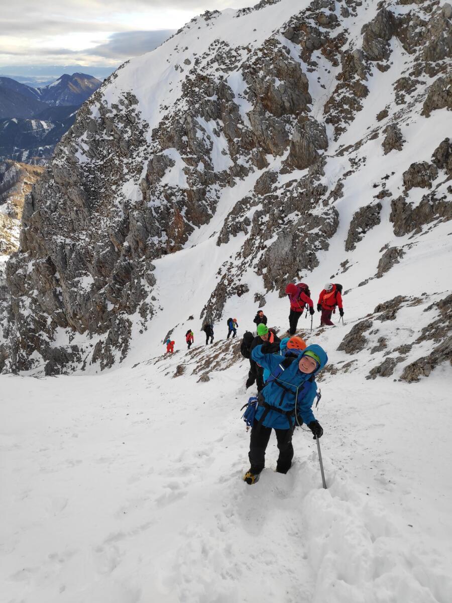 Naredni vikend, 22.01. i 23.01.2021. u masivu Karavanki na području Zelenice u Sloveniji održan je praktični dio modula. Započet je u kontroliranim uvjetima poligona ispod Vrtače (2181 m) gdje su polaznici uz stručno vođenje i demonstraciju imali priliku doživjeti iskustvo sigurnog napredovanja s cepinom i derezama na različitim nagibima padine, u postupcima kontroliranog zaustavljanja u incidentnim situacijama proklizavanja te u kretanju praktičnim navezivanjem i osiguravanjem planinarskim užetom. Na povratku na noćenje u Dom na Zelenici održana je izazovna vježba orijentacije u realnim zimskim uvjetima. Praktični dio modula zaključen je sljedeći dan ranom grupnom turom u idealnim uvjetima na Veliki vrh Begunjščice (2060 m) i to usponom kroz planinarski vrlo zanimljivu Centralnu grapu te silazom kroz Šentanski plaz.