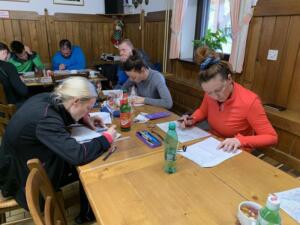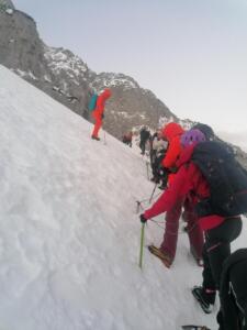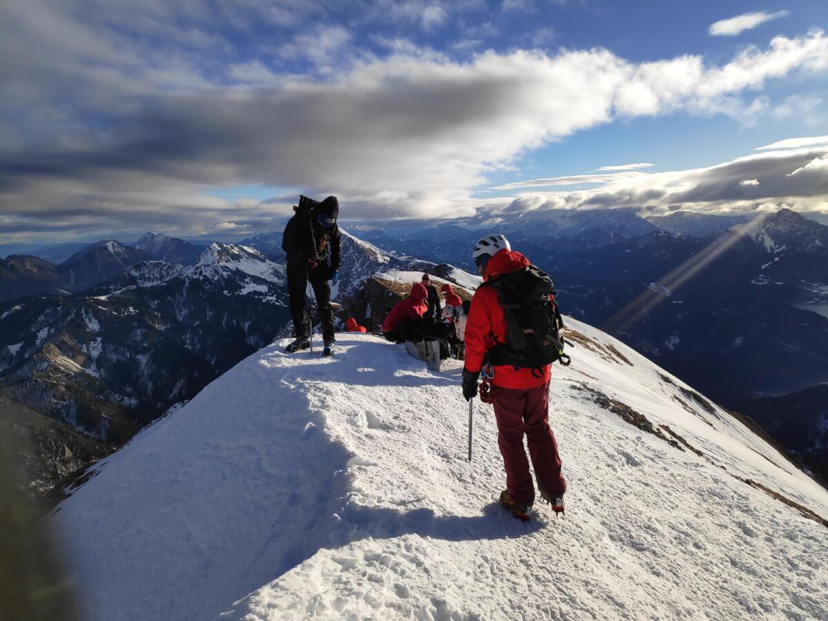 Sukladno dinamičkom planu modula 05.02. i 06.02.2022. na području planinskog prijevoja Vršič u Julijskim Alpama konačno je održan i završni ispitni vikend. Nakon jutarnjeg ponavljanja gradiva na pogodnom terenu podno ulaza „Hanzove poti“ na Prisojnik (Prisank, 2547 m), u Koči na Gozdu održana je i pismena provjera stečenog znanja koja je potvrdila primjerenu teoretsku stručnost svih polaznika. Sljedećeg dana u ranim jutarnjim satima ali u vrlo nepovoljnim uvjetima magle, hladnoće i vjetra izvršena je ispitna tura na Malu Mojstrovku (2332 m) klasičnim zimskim smjerom uspona kroz Vratca i preko Grebenca na njen vrh. U povratku s vrha na povoljnom mjestu u zaklonu zapadnog pobočja Male Mojstrovke uspješno je održana i praktična provjera vještina zimskih planinarski tehnika.