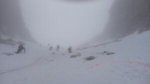 Sukladno dinamičkom planu modula 05.02. i 06.02.2022. na području planinskog prijevoja Vršič u Julijskim Alpama konačno je održan i završni ispitni vikend. Nakon jutarnjeg ponavljanja gradiva na pogodnom terenu podno ulaza „Hanzove poti“ na Prisojnik (Prisank, 2547 m), u Koči na Gozdu održana je i pismena provjera stečenog znanja koja je potvrdila primjerenu teoretsku stručnost svih polaznika. Sljedećeg dana u ranim jutarnjim satima ali u vrlo nepovoljnim uvjetima magle, hladnoće i vjetra izvršena je ispitna tura na Malu Mojstrovku (2332 m) klasičnim zimskim smjerom uspona kroz Vratca i preko Grebenca na njen vrh. U povratku s vrha na povoljnom mjestu u zaklonu zapadnog pobočja Male Mojstrovke uspješno je održana i praktična provjera vještina zimskih planinarski tehnika.